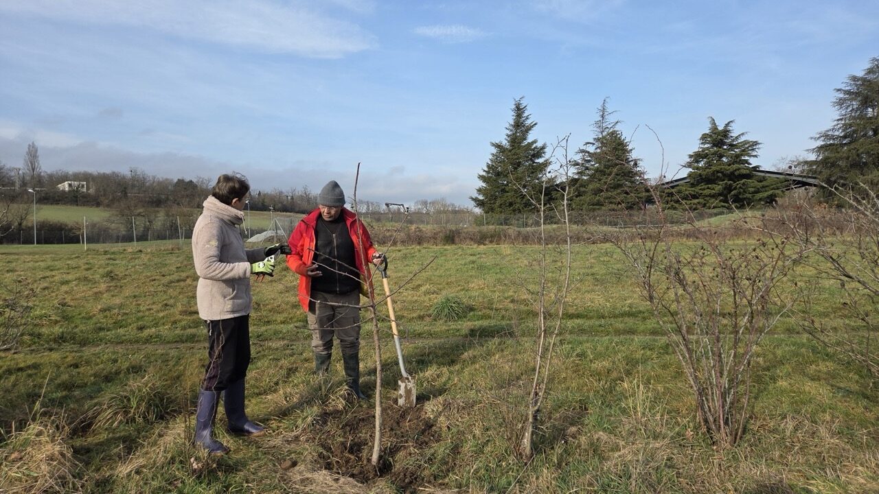 Nous avons aussi transplanté un joli prunellier qui se trouvait en dehors de la haie sauvage pour le remettre dans notre haie Nord qui protégera le verger des vents d’hiver.